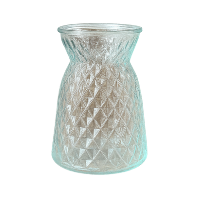 Add a sophisticated sparkle to your tabletops with the Aquamarine Diamond Glass Vase. This elegant vessel features an all-over embossed geometric diamond pattern and a flared rim, finished in a refreshing translucent teal. It’s the perfect height for small bouquets or dried pampas grass.